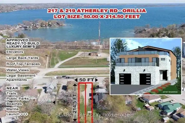 Premium Downtown Waterfront Building Lot with Approved Permits Ready to Build An exceptional opportunity to build a luxury side-by-side duplex in Orillia’s sought-after waterfront downtown area. Permit-approved and ready to go, this project includes over 4,000 sq ft across three levels, plus a legal self-contained basement apartment, private elevator, and a 50 sq meter rooftop terrace with breathtaking views of Lake Couchiching. Key Features: A large, premium lot with a survey and building plans included. Walking distance to parks, beach, marina, downtown shops, cafes, and restaurants R3 zoning permits 68 units (buyer to verify with the city). Vendor Take Back (VTB) financing is possible. The buyer is responsible for the development and building charges. 219 Atherley Rd is included in the purchase price. Taxes are currently based on vacant land. HST may be applicable. Whether you’re building a luxury duplex or exploring the full potential of multi-residential development under R3 zoning, this property offers substantial upside in a prime location. Note: Listing agent has an ownership interest in the property.