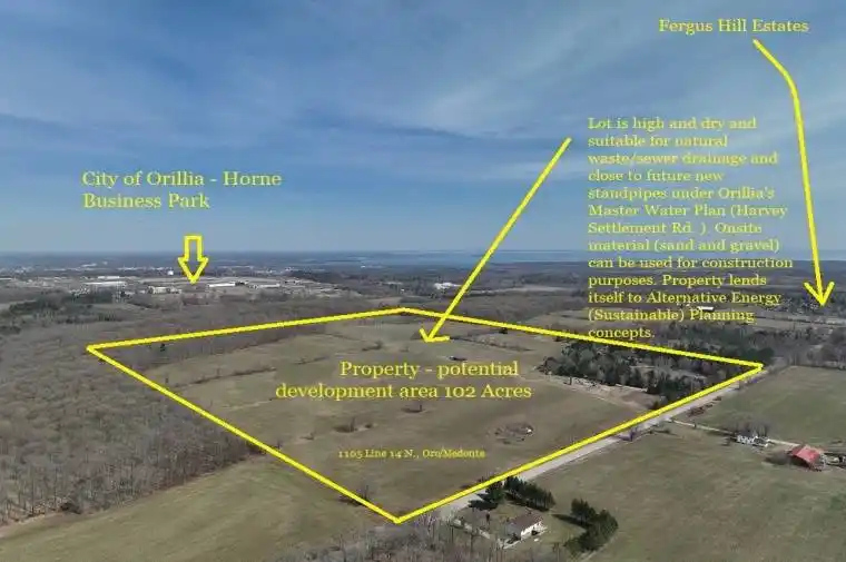 Investors/Developers. Invest In Just Over 102 Acres Just West Of Orillia’s West Ridge community of homes. Property Presently Falls Within the focus study area for Orillia’s Settlement Boundary Expansion ! Beautiful Panoramic Like Rolling Landscape Near Bass Lake. Currently Used For Growing Hay, Hobby Garden & Residential Use. Original 2 Story Stucco/Concrete Farm House Is Approx.1800 Sq. Ft. and Ideally should be torn down or rebuilt.. Some Out Buildings. Home And Property Being Sold “As Is”. Approx. 80 Acres Cleared. Buyer could Consider For Aggregate Development Potential . A Major Nat Gas Line Runs Through Property that can assist with future housing development. High elevation and slope of land is ideal for development of homes.