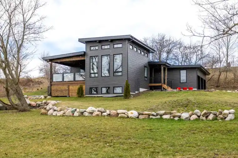 Country Living Meets Luxury Lifestyle! Discover this stunning custom-built home where modern design meets natural beauty, offering comfort, functionality & elegance at every turn. Step through the impressive 8-ft solid wood door into a bright and airy open-concept living space, seamlessly connecting the living room, dining area, and chef-inspired kitchen. From here, walk out to the 14′ x 17′ deck and take in serene views, the perfect spot for morning coffee or evening entertaining. Gourmet Kitchen is Designed for gathering & entertaining. Sleek black quartz countertops with a striking 9-ft center island. Custom-built cabinetry with hidden spice racks and organized storage. Floor-to-ceiling windows framing breathtaking views of the property & river. Thoughtful Design & Comfortable Living, 2,800 sq. ft. of finished living space (main + bsmnt, ), ICF construction throughout for superior insulation, soundproofing and durability. Wide hallway & stairway create a spacious, accessible flow. Two ethanol fireplaces add warmth and ambiance without emissions on both levels, 9-inch deep window sills, perfect for décor or indoor plants. Lower Level Retreat. Fully finished spacious bsmnt with large windows for natural light, Ideal for a rec room, home gym, or guest space. Energy Efficiency & Sustainability. Built in 2021 with an energy-efficient design, High-efficiency electric heat pump with propane backup and membrane roof. 8′ x 12′ greenhouse and 1,200 sq. ft. vegetable garden perfect for homegrown harvests. Oversized three-car garage with direct access to a functional mudroom/laundry combo features sink, countertops & ample cabinetry for everyday convenience. This move-in-ready gem is designed for those who value quality, efficiency, and a connection to nature. Whether entertaining guests, growing your own produce, or simply relaxing with breathtaking views, this property delivers the ultimate blend of comfort, sustainability, and beauty.