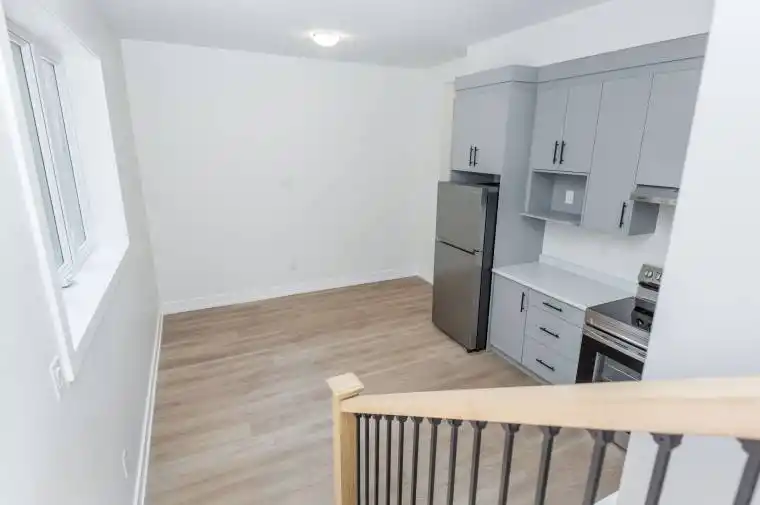 Brand new and never lived in, this lower-level 2-bedroom, 1-bath unit in a newly built triplex, soundproofed – is bright, open, and ground level. Includes one parking spot. The open-concept layout features high ceilings, stainless steel appliances including fridge, stove, and overhead exhaust fan, plus a stackable washer and dryer. With no carpet, a Lifebreath HRV system, individually controlled heating and AC, and soundproofed, energy-efficient construction, this home is comfortable and modern. Tenants are responsible for 20% of utilities, + hot water tank rental ($23), and snow removal for their own path. The unit comes with one parking space and is strictly non-smoking. Lease requirements include first and last month’s rent, credit check, proof of income, recent bank statements, NOA, references, and a completed rental application. Vacant and available immediately. Note, this is a mere posting and prior to any showings, applicants must be pre-approved by rental company
