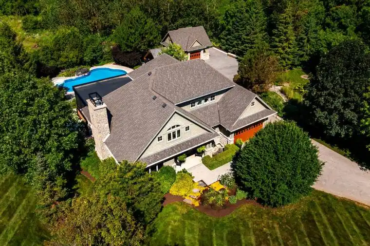 Set on 1.33 acres of private, thoughtfully landscaped grounds, this custom-built home is truly one-of-a-kind. The main floor offers a light-filled, open concept design with engineered hardwood floors throughout. The kitchen itself is a showpiece with counter-to-ceiling windows overlooking the backyard. It’s complete with quartz waterfall countertops, custom cabinetry, high-end appliances, a spacious island, a butler’s pantry, and a glass-panel wine room for the wine enthusiasts. The dining area flows into the living room with 17-foot ceilings and a limestone wood-burning fireplace (paired with a built-in elevator that delivers firewood right to your living space). The recent addition of a three-season screened room creates a seamless transition outdoors. The custom laundry room with built-in drying drawers adds to the main levels thoughtful design. Moving upstairs, the primary suite includes a walk-in closet and a beautiful ensuite, while the two additional bedrooms share an updated 4-piece bathroom. The finished lower level provides even more living space, has in-floor heating, two large bedrooms, a full bathroom, and an expansive recreation room ideal for family or guests. Take a step outside and entertain in the cedar cabana with built-in BBQ, or splash into the inground pool, or relax in the hot tub, or cozy up beside the propane fireplace. With a hydraulic lift, elevator to loft storage, and its very own built-in retractable bar, the detached workshop truly earns the title ‘The Ultimate Mancave’. Surrounded by mature gardens and featuring a carefully updated, meticulously maintained indoors, this property has been loved in every way and is ready to welcome its new owners.