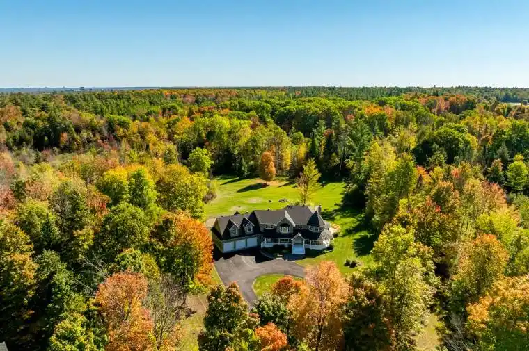 Welcome to an extraordinary retreat in prestigious Marchvale Estates, where over 4,100 sq. ft. of luxury living awaits on more than 3 acres of impeccably landscaped, private grounds. This custom-built residence combines timeless elegance with thoughtful family design, offering 5 bed, 4 bath, and a layout that perfectly balances everyday comfort with grand entertaining. Set back from the road along a picturesque tree-lined circular driveway, the home makes a striking first impression. A 3-car garage, dual front entrances, and dual staircases add both sophistication and multi generational living potential. Inside, natural light pours through abundant bay windows, showcasing sweeping views of the grounds. Three patio walkouts seamlessly connect indoor living spaces to the serene outdoors. The home boasts soaring 9ft ceilings, rich hardwood and ceramic floors, and a chefs kitchen. Formal and casual living areas offer flexibility for gatherings of any size, while a main-floor bedroom or office provides privacy and versatility. Upstairs, the lavish primary suite is a private sanctuary, complete with a spa-inspired 5-piece ensuite. A second private suite with its own ensuite and walk-in closet includes an adjoining bonus room; ideal for a playroom, media room, dressing roon, or teen retreat. Two additional bedrooms complete the family-friendly upper level. The fully finished lower level expands the living space beautifully with new flooring, direct access to the garage, ample storage, a bar and endless possibilities for a home gym, rec room, or guest accommodations. A geothermal system ensures year-round comfort with impressive energy efficiency. Outdoors, an irrigation system ensures lush, low-maintenance grounds, perfect for play and relaxation alike. Ideally located just 5 mins from Kanatas high-tech hub, top schools, golf & everyday amenities. With quick access to Highway 417, this estate offers the ultimate blend of privacy and convenience.