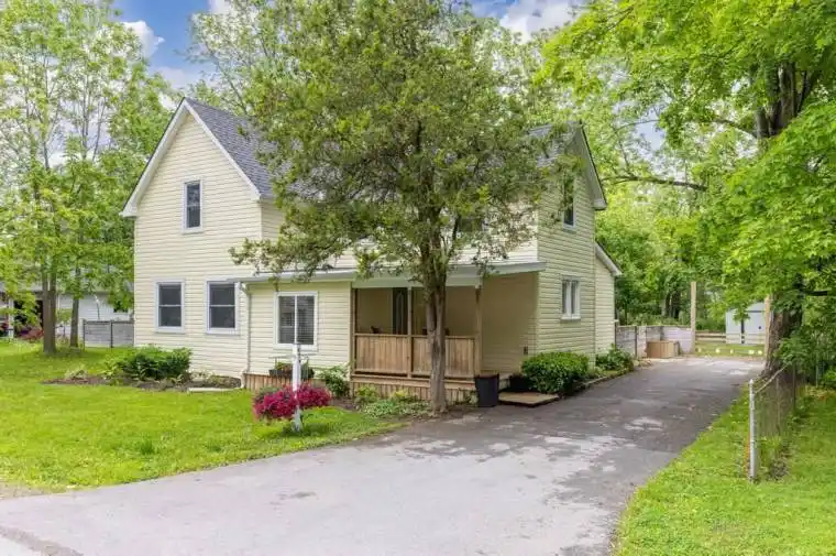 DEAL FELL THRU! Great opportunity here. Country living, right in town! Welcome to 474 North Mill St in the heart of the quaint village of Ridgeway. Adorable renovated farmhouse with main floor open concept layout on a specular double size lot. The front covered porch, with wood strapped ceiling and pot lights, is the perfect space to sit back and enjoy life. Step inside to an enclosed 4 season heated rm that was once part of the covered porch (2018 renovation), and is ideal as a mud rm or office space. The bright and sunny kitchen offers plenty of cabinetry and counter space. The dining area is spacious and can accommodate the largest of family sized tables. The living rm is super nice with feature wall, open staircase to the 2nd floor, big windows to let the sunshine in and easy access through sliding doors to the backyard deck, lawns, fire-pit, and gardens. Upstairs you will find a very pretty master bdrm with closets, a good sized 2nd Bdrm with new closets, and a renovated 4 pc wshrm. Bonus main floor Laundry and mud rm is just off the kitchen as is a pretty 2 pc wshrm. A small basement houses the furnace, tankless hot water heater, and sump pump. The fenced backyard is an oasis of privacy and greenery with plenty of space for the kids, dogs, vegetable gardens, a future pool, potential Garden Suite Accessory building, or possible severance. Freshly painted, this spick and span adorable Character home is in a great location steps to the shops and restaurants of Ridgeway and Lake Erie Beaches. New Steel door with full glass between kitchen and front mudroom (2025), Hot Water on Demand (2017) Stove (2022), Built in Microwave (2022), Washer, Dryer, Paneled Refrigerator (as is), 4 new smoke detectors (2024), Sump Pump (2025), High Efficiency Furnace (2017), AC (2017), Mechanical Fresh Air Unit (2017), Garden Shed, Roof (2015). Buyer to do own due diligence regarding possible severance and or accessory garden suite.