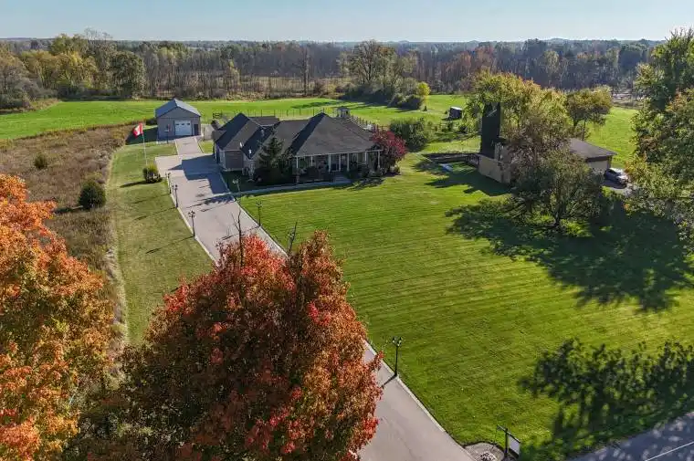 Offering nearly 7,000 sq. ft. of finished living space – 3,974 sq. ft. above grade and 2,938 sq. ft. below, this custom-built, solid brick bungalow loft combines modern sophistication with country elegance. Perfectly set on a serene 1.52-acre estate in Cambridge’s prestigious North Dumfries Township, it’s designed for both grand entertaining and private, everyday living. A rare floor plan for a bungalow, it features oversized rooms, a thoughtful layout, and two distinct wings. The main level showcases a chef’s kitchen with an oversized island, generous dining area, walk-in pantry, and a formal dining room ideal for gatherings. A separate library or office with coffered ceilings adds charm and flexibility, while the secluded primary suite boasts a double-sided gas fireplace shared with its spa-like ensuite. Additional bedrooms are tucked into their own wing for maximum privacy. The fully finished lower level expands your living space with two bedroom suites, a vast entertainment zone, a glass enclosed home gym, and abundant storage. A finished loft with balcony accessible via interior stairs and an exterior walk-up adds even more versatility. Nearly 1,000 sq. ft. of covered front and rear porches connect you seamlessly to the outdoors. The extra-deep attached garage accommodates up to five vehicles and includes a fourth rear garage door to the backyard. A 30 x 52 shop offers exceptional space for hobbies, projects, or additional storage. Built with premium materials and exceptional craftsmanship, this residence offers unmatched comfort, privacy, and enduring quality – an ideal blend of rural tranquility and proximity to city conveniences.