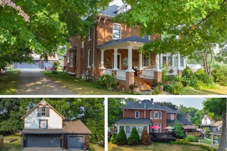 Welcome to this magnificent 2-1/2 storey brick CIRCA 1870’s Century home, located in the downtown section of the Village of Colborne. This corner 0.63 acre lot with interlocking brick driveway running through the property provides access/egress to both Division and Creek Streets. The home’s grandeur is one of the largest in the village, accentuated by a huge front veranda with white doric columns and ornate brackets under the wide eaves. Designed as an Italianate vernacular style, this Victorian home boasts an array of architectural details, including some window stained glass inserts, huge baseboards, extensive wood trim and hardwood flooring, glass door knobs, almost 10′ main floor ceilings, plus a welcoming front foyer featuring a lit bannister and convenient powder room. The updated family kitchen showcases large porcelain tiles, a stylish white backsplash, s/s appliances and white cabinetry with quartz counters. The island includes a breakfast bar and the waffle white ceiling extends through to the windowed eating area. Off the kitchen, there is a convenient den, plus an expansive combined formal living/dining room with gas fireplace, hardwood floors and bay window area. Relax in the sunroom, complete with a cozy gas fireplace, abundant windows, stained wood ceiling, or step outside to the south deck with gazebo. The rear mudroom also features a gas fireplace with board-and-batten finished walls, plus access to full basement with concrete floor. Venture upstairs to the 2nd level with 3 well-appointed bedrooms, including a primary suite with a bay window and double mirrored closet doors. The upper level also features a large combination bathroom/ldry area with porcelain floor tiles, large walk-in shower, standalone soaker tub plus laundry facilities with front-load appliances. A spiral oak staircase leads to the 3rd level with a 4th bedroom, gas linear fireplace, round Palladian window dormer, skylights, plus 3-pc ensuite, mirrored closet and generous storage.