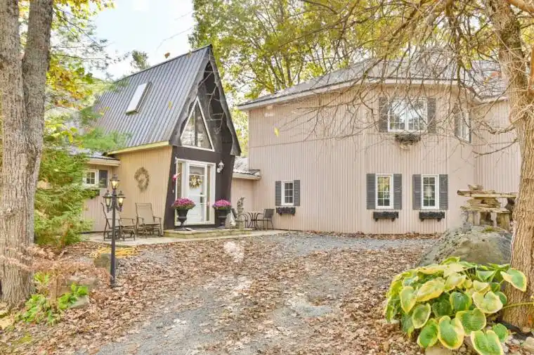 ONE OF A KIND CUSTOM ARCHITECTURAL DESIGNED HOME ON THE BANKS OF THE MAJESTIC BLACK RIVER! A truly unique gem that must be seen to be appreciated. Full of Character and Charm throughout features custom millwork, timber beams, cathedral wood ceiling designs, stain glass window pieces and custom fireplaces mantle and more! This stunning 3,500 sq foot home is perfect for families that need space, features 4 Bedrooms & 5 Bathrooms. Original home built in 1984 with rustic charm and large addition added in 2001, intricately crafted masterpiece designed by the owners. Includes options for separate living quarters & space for income or in-laws. Beautiful spacious formal dining room with garden doors leading to deck overlooking the water. Primary Suite on main level features crafted wood beams, custom octagon shaped space, lots of natural light & walkout to deck, large walk in closet plus 5 PC bathroom. Grand staircase with stunning stain glass window & custom cathedral wood ceiling design leads to upper level family room or large studio space with lots of natural light. Main level area with cozy propane fireplace with custom mantel & wood beams, open to eat-in kitchen area filled with natural light from the skylights. Circular Staircase to upper level which provides 2 bedrooms & full bath, 1 bedroom with it’s own balcony. Main level laundry room includes new washer & dryer. Extra workshop area for storage has two separate entrances includes mudroom area & bathroom. Enjoy the peace and serenity of the calming sound of the river flowing from multiple decks and balconies that offer a perfect spot for relaxing & enjoying your morning coffee. Cozy screened in gazebo to unwind in nature & listen to the flowing rapids! This well maintained home is move in ready, metal roof, new septic in 2021. Looking for a piece of paradise, large family home, getaway/sanctuary or air bnb, this property is a must see! Located just off Highway 7, Close to Tweed for all amenities. Priced to sell!