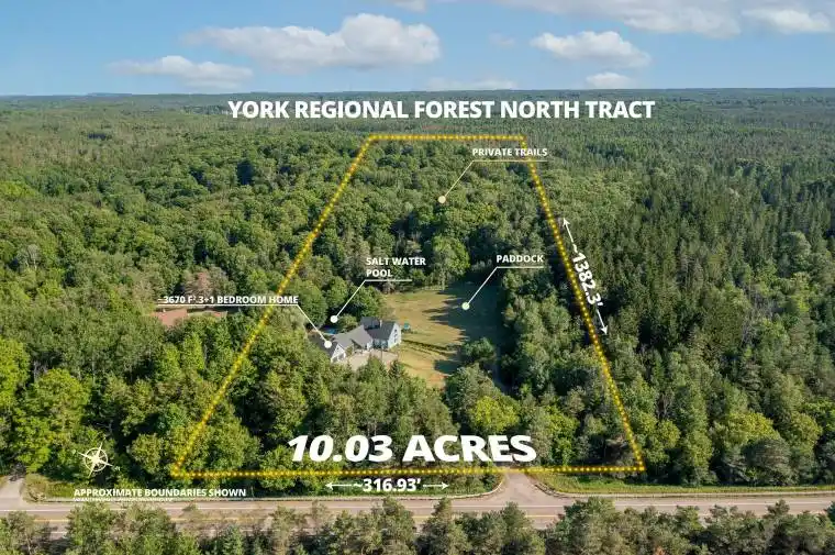 Set on a Breathtaking 10.03-Acre Lot With Approximately 317 Feet of Frontage and Stretching Over 1,380 Feet Deep, This Exceptional Property Backs Directly Onto the York Regional Forest North Tract–Offering Access to Approximately 800 Acres of Pristine Trails and Natural Beauty. The Grounds Present a Harmonious Blend of Open Space, Manicured Lawns and Gardens, a Paddock, Mature Forest, and Private Walking Trails. Perched Atop the Property Is a Striking 1-Storey Residence Offering Approximately 3,670 Square Feet of Finished Living Space. The Home Features 3+1 Bedrooms, a Finished Walkout Lower Level, a Three-Car Garage With a Workshop and Loft Space, an Inground Saltwater Pool, and Efficient Ground-Source Heating. Flooded With Natural Light and Showcasing Panoramic Views, the Great Room Boasts Soaring 22-Foot Cathedral Ceilings With Exposed Wood Beams, Dramatic Floor-To-Ceiling Windows, Rich Hardwood Flooring, and a Stunning Wood-Burning Fireplace–Making It the Heart of the Home. The Custom, Family-Sized Eat-in Kitchen Is Designed for Gathering and Function. It Features a Beamed Ceiling With Large Skylights, a Generous Center Island With Seating for Four, Stainless Steel Appliances, a Wood Stove, Pantry, and a Walkout to a Spacious Deck Overlooking the Pool and Grounds. The Main Floor Primary Suite Is Bright and Inviting, With an Exposed Beams Ceiling, Generous Natural Light, and a Private 3-Piece Ensuite. Experience the Perfect Blend of Privacy, Nature, Comfort and Convenience All While Being Just Minutes From Highway 404 and the Shopping, Dining, and Amenities of Newmarket.