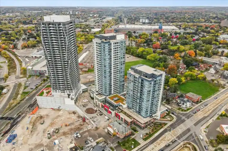 VIEWS FOR DAYS!! Welcome to Station Park – where modern living meets unmatched convenience in the heart of downtown Kitchener. With thousands spent on upgrades, this corner 2-bedroom, 2-bath unit comes with underground parking and storage locker. Perched up on the 9th floor, enjoy spectacular views of the city overtop the trees. This spacious and well appointed unit offers an upscale bright kitchen, with upgraded island with seating, clean quartz countertops, penny shaped backsplash and ample counter and cupboard storage. The kitchen opens up to the living room that is filled with tons of natural light and unobstructed views. Make your way to the primary bedroom, fit with ceiling to floor windows all the way around and spectacular views of the neighbourhood and Uptown Waterloo. Enjoy your private ensuite with glass walk-in shower. The second bedroom is a great size – perfect for an office or for guests with another full bath. Your private balcony is the perfect place to unwind. The unit features in-suite laundry, 1 underground parking space and storage locker. Internet is included in the condo fees. Steps from Google, the School of Pharmacy and Medicine, the MedTech Hub, CommuniTech, KPMG, and countless restaurants, cafes, and shops. With the LRT and GO Train at your doorstep, the entire city and region are within easy reach. Station Park is known for offering some of the most impressive amenities in the region. From a fitness studio with yoga space, hydrapool and hot tub, to an ice rink, bowling alley, arcade hall, jam room, amphitheater, party room, outdoor work pods, sauna, Peleton room – you’ll never run out of ways to work, play, or unwind right at home. Don’t miss the chance to experience a vibrant, connected lifestyle at Station Park – downtown living at its very best.