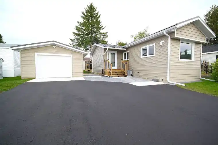 WOW! NEW, NEW, & MORE NEW! Completely renovated or rebuilt inside and out. This move in ready 2 bedroom 2 bathroom home has been recreated just for you to enjoy for many years to come. Excellent layout provides a walkout to large private deck off primary bedroom, bonus office with closet and attached 1/2 bath, large foyer with coat closet, covered porch, open concept kitchen with cozy gas fireplace. Too many upgrades to list…featuring all NEW in 2024/25; steel roofs on all 3 buildings, siding, soffit, fascia, troughs, exterior lighting, huge new asphalt driveway, paver stone, all new windows, and new exterior doors, new decks, upgraded insulation, new drywall, all new flooring, totally new bathroom, 5 brand new appliances, new kitchen, new central air unit, all interior trim & doors, and paint, new pot lighting and light fixtures, and much much more! Walk out to large private deck. Pride of ownership and attention to details abound. Garage was taken down to foundation and rebuilt with new framing, insulated walls and doors, windows, garage door opener, and hydro. Amazing opportunity. Located close to Orillia and major amenities. Land lease fee includes road maintenance, garbage removal. Monthly fee inclusive of Taxes 30.00 , Water 33.00, and lease fee = 538.00 total.