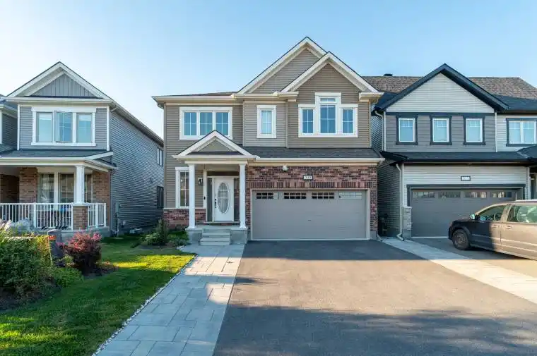Welcome to 309 Proxima Terrace, a beautifully upgraded and move-in ready Mattamy Parkside model in the sought-after Half Moon Bay community of Barrhaven. This sun-filled 4+1 bedroom, 5 bathroom home with a fully finished basement is ideally located on a quiet street just steps from top-rated schools, parks, wetlands, trails, and transit. Showcasing 9-ft ceilings, engineered hardwood on the main level, and luxury finishes throughout, the open-concept layout includes a gourmet kitchen with quartz counters, extended ceiling-height cabinetry with molding, deep pot drawers, pull-out pantry, high-end stainless steel appliances, and a powerful 680 CFM range hood, flowing into a refined dining area and great room with tray ceilings, custom wall unit, tiled feature wall, and cozy gas fireplace. A private den/office, built-in mudroom, and discreet powder room add everyday function. Upstairs, 4 generous bedrooms all feature walk-in closets; the primary suite offers a spa-inspired ensuite with freestanding tub, glass shower, and double vanity, while a second bedroom has its own ensuite and the other two share a Jack & Jill bath. The second-floor laundry adds convenience. The finished basement includes a rec room, full bath, 24-hr water-resistant flooring, home theatre pre-wiring, and an extra office or gaming area. Extensive builder and custom upgrades include a solid wood spiral staircase, larger basement and ensuite windows, chandeliers, recessed smart lighting, UV water purification, tankless water heater, reconfigured plumbing for rapid hot water, widened driveway, landscaped yard with stamped concrete patio, 7-ft low-maintenance PVC fence, painted garage with concealed wiring, and custom décor elements like TV accent wall, foyer detail, and kitchen backsplash. Appliances (Bosch, Frigidaire, Whirlpool, LG) installed in 2021 remain in excellent condition. Some of the pictures are virtually staged, 24 hours irrevocable for all offers.