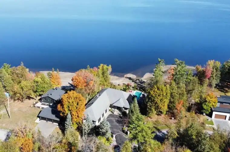 This gorgeous 5 bedroom, 3 bathroom waterfront home is truly one of a kind. Enter into the foyer and immediately be taken away by the breath taking views of the hills across the stunning waterfront. The foyer opens up to the spectacular living room featuring a fireplace, 2 skylights and 2 large sliding doors leading out to the screened in deck. This grand living room is open to the eat-in kitchen featuring stainless steel appliance, built in wine racks, ample cupboard space and an addition sliding door leading out to the massive deck. On the main level you will also find the incredibly spacious primary bedroom featuring a walk-in closet, 4 piece ensuite, fireplace and additional sliding doors leading out to the deck. This is the perfect couples retreat in your very own home. On the lower level you will find a centrally built wet bar and home theatre, perfect for entertaining, along with addition sitting space, 4 bright bedrooms and a 6 piece bathroom. The 1800 sqft heated garage with high ceilings offers ample storage space and opportunity for car lifts. The most notable part of this one of a kind home is by far the outdoor space. Not only is the screened in deck, massive uncovered deck, and large yard a wonderful space to enjoy all to yourselves or host guests, but the in-ground infinity pool and sandy shore line is every outdoor lovers dream. Enjoy a day of boating on the Ottawa River from your very own private dock. The spectacular waterfront offers prime views of sunrise and sunset all summer long and year round sunsets that are truly remarkable. No detail was missed inside or out in the design of this stunning property. NEW IN 2025 : NEW ULTRA VOILET SYSTEM, REVERSE OSMOSIS SYSTEM, FRIDGE, MICROWAVE, WASHER, DISHWASHER,HEAT PUMPS, POOL COMPUTER, POWDER ROOM TOILET, 3 WATER SOFTENERS – ALL NEW THIS YEAR.