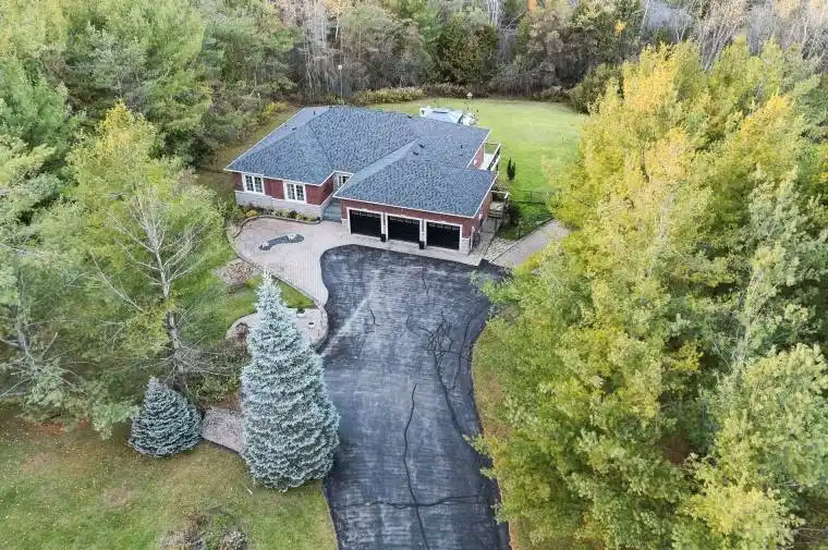Perched Atop A Gently Rolling Landscape This All Brick And Stone Bungalow Commands Attention From The Moment You Arrive. A Sweeping Asphalt Driveway Leads To A Custom Built Residence That Blends Refined Craftsmanship With Serene Country Views Stretching To The Horizon. Inside Light Pours Through The Open Concept Main Living Space Anchored By A Corner Fireplace And Framed By large Windows That Invite The Outdoors In. The Dining Area Flows Effortlessly Into A Spacious Eat In Kitchen, The Kind Of Space Where Every Sunrise Feels Like A Personal Moment And Every Evening Ends With A Panoramic Sunset Over Your Own Two Acres. Step Outside To An Expansive Deck That Overlooks A Private Tree Lined Backdrop – An Entertainers Dream Or The Perfect Place To Press Pause On Life. The Primary Suite Offers Quiet Sophistication With A Newly Renovated Ensuite And A Walk-In Closet Designed With Purpose, Two Additional Bedrooms With Built-Ins And A Main Floor Full Bath Complete The Main Level. Descend The Oak Staircase To A Full Walkout Lower Level, A Sunlit Extension Of The Home With Two More Bedrooms, A Family And Recreation Area, 3 Piece Bath And Even A Dedicated Space For Your Tanning Setup Or Fitness Routine. With Its Natural Light And Private Entrance The Possibilities Are Endless For An In Law Suite Guest Retreat Or The Ultimate Home Studio. The Attached 3 Car Garage Speaks To Convenience While The Detached 4th Bay Workshop (With Hydro) Delivers On Ambition. Every Inch Of This Property Was Built With Thought, Scale And Purpose. This Isn’t Just A Home, Its A Statement, Where Craftsmanship Meets Calm And Every Detail Reflects A Life Well Built. Recent Upgrades Include A Renovated Primary Ensuite (2020) And Kitchen (2021), New Deck (2021), Concrete Pad And Fire Pit (2023), New Water Softener (2023), High-Efficiency Air Conditioner (2025), New Main Floor Flooring (2025), And Upgraded Main Floor Bathroom Toilets (2024).
