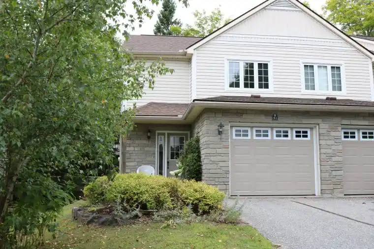 This is your opportunity to purchase a condominium townhome within walking distance of downtown Huntsville. This premium end unit is nestled in a 12-unit complex (3 buildings of 4 units each). This cul-de-sac is tucked off Dairy Lane. This home features 3 generous bedrooms, an ensuite for the primary bedroom with a walk-in closet, another 4-piece bathroom, plus a 2-piece powder room on the main level. The main floor features hardwood flooring in the open concept living/dining room, oak kitchen cabinets with pass-through, a natural gas fireplace for added ambiance, carpet staircases, and a glass sliding door to a spacious private deck. A large front foyer, welcomes guests, or provides convenient direct access to the garage. The lower level is unfinished with a laundry utility area and a large storage room and a workroom. This lovely unit is air-conditioned, landscaped and offers a carefree & maintenance-free lifestyle. Priced for you to add your style and décor. Quick closing available so you can start living conveniently now. The grass is cut for you and no snow to shovel! Perfect for retirement living or those with a busy lifestyle.