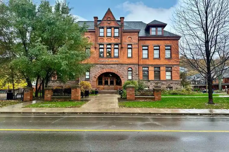 Welcome to this stunning, spacious open-concept suite in the Stinson School Lofts, offering escarpment vistas from the oversized windows! Enjoy seamless flow between the living, dining, and kitchen areas-perfect for entertaining or relaxing at home. Stainless steel kitchen appliances add a luxury touch. The large foyer features built-in shelves and a bench, offering both style and practicality. The primary bedroom boasts a huge walk-in closet, while the modern three-piece bath is equipped with a walk-in shower, and a bonus in-suite laundry for your convenience. Soaring 14′ ceilings, exposed brick and original maple hardwood floors add character and warmth throughout. Just steps from scenic trails, a dog park, golf courses, and local restaurants, this unique property offers the best of urban living. Stinson School Lofts won City of Hamilton urban design and architecture awards 2015 award of outstanding achievement and excellence in adaptive reuse.