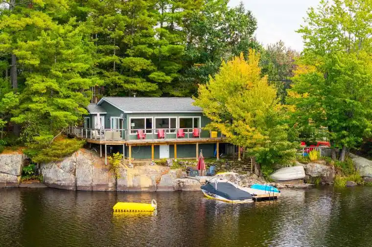 Perched atop a magnificent granite outcropping in the heart of Muskoka, this exceptional, fully winterized cottage or year-round residence embodies the essence of refined lakeside living. With 214 feet of pristine northwest frontage, the property captures breathtaking panoramic views of Brandy Lake – complete with spectacular evening sunsets.The open-concept interior showcases soaring vaulted ceilings, expansive windows, and an effortless connection to nature through the glass-railed lakeside deck. The primary suite enjoys serene lake vistas and a private walkout to the deck, offering a seamless indoor-outdoor flow ideal for morning tranquility or sunset relaxation.Thoughtfully updated throughout, the home features a new propane furnace, windows, premium flooring, a fully fenced yard, deck, dock, storage shed, new exterior siding, interior accent walls, interior paint throughout, all new appliances, new water filtration system and interior/exterior decor. Every detail has been curated to balance modern comfort with timeless Muskoka charm. Set on a year-round road just minutes from Port Carling’s boutique shops and dining, this retreat offers both privacy and convenience. Experience the Muskoka lifestyle at its finest – where natural beauty, tranquility, and sophistication meet on the shores of Brandy Lake.