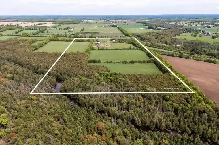 Set on 46 acres along the clean, cool waters of the Rocky Saugeen River, this log farmhouse is one of the last remaining century farms in Grey Highlands . Originally built in the 1880s and expanded in the 1970s, it combines historic features with modern upgrades. The main level of the home features an updated kitchen with a new garden door that brings in natural light. Upstairs, the primary bedroom offers wide plank floors, a walk-in closet, a 2-piece bathroom and could be converted back into 2 bedrooms. The home also includes a den that could be used as an office or guest room, and a modern laundry area with a new washer and dryer. Updates include a steel roof (2021), a 200-amp electrical panel, a generator plug, and a 2022heat/cooling pump with a backup electric furnace. A wood insert stove adds extra heat during the winter. The land includes approximately 25 workable acres currently seeded in regenerative hay crops. Approximately 15 acres are securely fenced and ready for hobby farming or equestrian pursuits. There are five paddocks with two electric outlets and one no-freeze hydrant for easy winter care. Original fence rows and walking trails lead to the Rocky Saugeen river. Outbuildings include a 60′ x 88′ board and batten barn built in 2020 with hydro and water, and a 30′ x 50′ detached garage/shop, also serviced with hydro and water. Additional structures include a chicken coop, woodshed, and a small animal shelter cat condo. Located just minutes from Markdale and a 35-minute drive to Owen Sound, this home places you in the heart of four-season recreation with skiing, hiking, fishing, paddling, snowmobiling, and more surrounded by the natural beauty of waterfalls, trails, and rivers.
