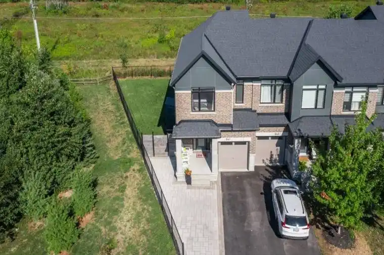 Welcome to 641 Putney Crescent – a beautifully upgraded 3-bedroom end-unit townhome in Stittsville’s sought-after Westwood community. This 2020 Cypress model provides approx. 1985sqft of living space and is situated on a premium lot with no rear neighbours and added side privacy, being steps from Putney Woodland Park. This home offers bright, modern living space designed for comfort and style. Step inside to a spacious foyer that opens into a warm, open-concept main floor. Hardwood flooring, large windows, and a thoughtful layout create an inviting atmosphere for both everyday living and entertaining. The kitchen features extended cabinetry, upgraded quartz countertops, a generous island, and excellent workspace. The living and dining areas flow seamlessly together, with views of the private backyard. A formal dining room with wainscoting and a powder room complete the main level. Upstairs, you’ll find three well-sized bedrooms, including a peaceful primary suite with a walk-in closet and a stylish 4-piece ensuite incl. quartz counters. The secondary bedrooms offer flexibility for family, guests, or a home office. Second-floor laundry for added convenience. The finished lower level expands your living space with a cozy recreation room highlighted by a gas fireplace – ideal for movie nights or a playroom. A rough-in for a future bathroom provides added potential. Outside, enjoy a quiet setting with mature surroundings, backing onto the Trans Canada Trail, great walkability to parks, schools, and easy access to shopping, commuter routes (Highway 416, Highway 417) and CARDELREC Recreation Complex (ice rink, swimming pool & more!). This is a move-in-ready home offering comfort, modern finishes, and a standout location in a growing neighbourhood.