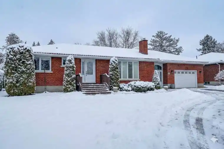 Welcome to 6 Roundhay in family-friendly Manordale, Nepean. This extremely well-maintained and thoughtfully enlarged 2+1 bedroom bungalow is sure to impress. Energy efficiency is a key feature, thanks to the newer heat pump (2023). The main level features gleaming hardwood flooring throughout the principal living areas and bedrooms. The original 3-bedroom layout was redesigned to create a spacious primary suite. The bright, functional kitchen offers stainless steel appliances (2023), granite countertops with an undermount sink, ample pantry storage, and a comfortable breakfast area. Just off the kitchen is a cozy den with a walk-out to the beautifully landscaped backyard. The main floor also includes a well-appointed 3-piece bathroom and an inviting living room complete with a gas fireplace. The expanded lower level provides exceptional additional living space, including a large family room, wet bar area, 3-piece bathroom, a 3rd bedroom, an oversized laundry/workshop area, and a cold room. The lower level was enlarged as part of the extension added when the spacious double garage with inside entry was built. Situated on a generous 78′ x 100′ lot, the property features a high double garage with abundant storage, attractive interlock that wraps around the home, and two backyard sheds-one being a large, two-storey structure on its own concrete pad. The layout of the home also lends itself well to future SDU development, ideal for multi-generational living or rental potential. Major updates: Steel roof (2015) with transferable 55-year warranty, Heat Pump/AC & Hot Water Tank (2023), Appliances (2023), Washer/Dryer (2015). Some photos have been virtually staged.