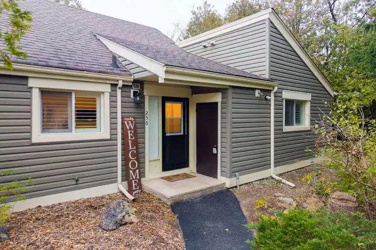 Bungalow living with a modern, elevated feel! The updated 2-bedroom, 2-bathroom end-unit offers privacy, comfort, and thoughtful design throughout. Perfect as a ski chalet, weekend retreat, starter home, or downsizing opportunity, it’s set among mature trees with an inviting outdoor space ideal for relaxed entertaining. Inside, the open-concept layout is both functional and refined. The living room features a gas fireplace and a walkout to a quiet desk surrounded by nature. Forced-air gas heating and central AC provides a year-round comfort. The kitchen is finished with quartz countertops and soft-close drawers, offering a clean, contemporary aesthetic. High-end details continue throughout the home, including California shutters, upgraded lighting, and shiplap ceilings. A designated parking space at the front door and two additional storage areas add everyday convenience. Impeccably maintained and move in ready-all at an affordable price!
