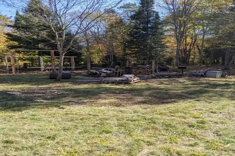 This peaceful and private 3-acre property sits on a paved, plowed year-round road with mail delivery and hydro at the lot line. Across the road are two small horse hobby farms, adding to the quiet rural charm. The forest is carefully maintained, with underbrush cleared to 7-8 feet for an easy-to-walk, park-like setting. Mossy paths, natural brush fencing along the lot lines, and a mix of hardwoods and softwoods-including young oak, beech, maple, larch, cedar, tall spruce, and 70′ red pines-create a beautiful, tranquil landscape where deer often wander. Three solid, fully insulated bunkies provide comfortable on-site living while you build your dream home. The rear bunkie is 10′ 12’+ with a soaring 17′ pine ceiling, loft, large windows, and an antique wood stove ready for installation. Two additional 10′ 12′ bunkies in the center of the property feature cultured stone and wood exteriors, metal roofing, full insulation, and one includes a loft and antique stove. Combined, they sleep 6-8 people. A 6′ 8′ tool shed and a 5′ 8′ outhouse with a shower stall offer added convenience. All structures are solid, sealed, pest-proof, and sold as-is.The property includes seven skids of cultured stone worth several thousand dollars, extra sheets of metal roofing, and stacks of 1″-4″ live-edge lumber. A three-barrel water-catchment setup and two self-watering raised garden beds with squirrel-proof hinged covers make gardening effortless; the beds recently nurtured 30 walnut trees now planted along the lane. A natural stone fire pit, chopped firewood, and the beginnings of a pole barn/log shed complete this unique offering. With no bear sightings ever-just peaceful woodland living-this is an ideal place to settle, explore, and build your future.
