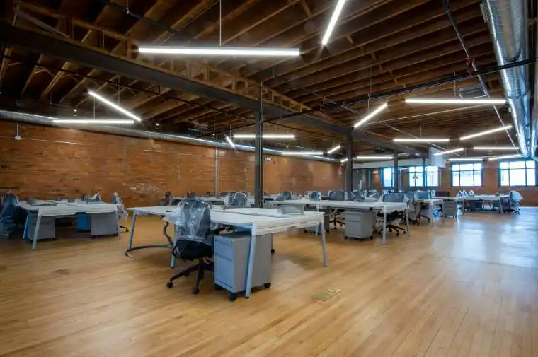 Stunning, turn-key penthouse office space in the heart of Hamilton’s central business district! This beautifully rebuilt building blends historic character with modern infrastructure, creating one of the most impressive office environments in the city. Exposed stone and brick walls, steel posts, and gleaming hardwood floors are complemented by glass-enclosed offices and meeting rooms for a sophisticated, contemporary feel. A spacious kitchen and seating area are located toward the rear of the unit, adjacent to a unique “yoga / conference room” featuring a roll-up garage door. Need a breath of fresh air? Step out onto the shared rooftop terrace for a break or informal meeting. Just steps from everything – courthouses, banks, Restaurant Row, transit, shopping, and more – this exceptional space is ideal for any company looking for an office that stands out for its quality, design, and employee experience. Note: Furniture pictured not included in listing offering.