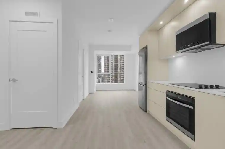 Welcome to Westerly 2 by Tridel, a modern condominium community offering efficient and contemporary living in the heart of Islington-City Centre West. This bright 1-bedroom, 1-bathroom suite offers 478 sq. ft. of thoughtfully designed living space with clean finishes and a functional open-concept layout ideal for urban living. The contemporary kitchen features integrated appliances, sleek flat-panel cabinetry in a light neutral tone, quartz countertops, and under-cabinet lighting. The kitchen flows seamlessly into the combined living and dining area, where wide-plank flooring and a large window bring in excellent natural light and provide a comfortable space for everyday living. The bedroom is well-proportioned with a large window and generous closet space, while the modern 4-piece bathroom showcases full-height tilework, a deep soaker tub with tiled surround, chrome fixtures, and a sleek vanity with integrated lighting. In-suite laundry is conveniently tucked into a dedicated closet just off the main living area. One parking space is included for added convenience. Residents of Westerly 2 enjoy access to an impressive collection of amenities including a fitness centre, yoga studio, co-working lounge, party room, kids’ zone, outdoor terrace, and 24-hour concierge. Ideally located steps to Islington Subway Station, grocery stores, parks, dining, and everyday conveniences, this suite offers comfortable, well-connected living in a desirable Etobicoke neighbourhood.