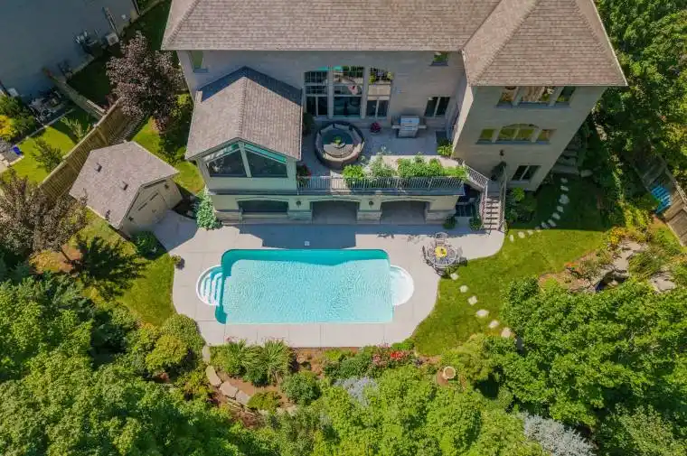 This 6,067 total sq. ft. European-inspired residence, thoughtfully designed by The Barnswallow Company, embodies timeless appeal, enduring craftsmanship, artistry, and refinement. Positioned at the top of Eagletrace Drive’s prestigious cul-de-sac, this property enjoys the rare privilege of backing on Medway Valley Heritage Forest & ravine. The striking stone, stucco, and brick facade is complimented by a forecourt with manicured lush gardens and a sculptural water feature. The grounds unfold into a resort-style retreat with an in-ground saltwater pool, screened veranda, walkout partially screened loggia, raised terrace, serene waterfall, thriving pond, and an armour stone fire retreat, making this an extraordinary property to host. Inside, the main level exudes grandeur & warmth. The two-story great room is embellished with a cast stone gas fireplace, walnut hardwood floors, and expansive Andersen windows showcasing beautiful tree canopy views. Flow seamlessly into the expansive European-inspired kitchen, discovering embellished millwork, Cherry cabinetry, Sub-Zero fridge, Wolf, Bosch, and KitchenAid appliances, butlers pantry, kitchen pantry, breakfast nook, and a furniture style 7.4′ Delicatus granite island. A formal dining room, sun-filled study, and family room with wet bar elevate the living experience. The upper level is crowned by an indulgent primary retreat – a serene, romantic sanctuary with sweeping treetop views, a lavish 6-piece ensuite with limestone, bidet & water closet, and a custom oversized dressing room with jewelry cabinetry. Three junior suites with custom closets, two with a shared 4-piece Jack & Jill, provide privacy & comfort. The lower level walkout was thoughtfully designed to bring together leisure and wellness with a recreation lounge, wet bar, sound-isolated music room, home gym with integrated sauna, craft/creative room & a thoughtfully designed in-law suite with kitchenette. Recent upgrades: Roof, furnace, AC, hot water tank-2023.