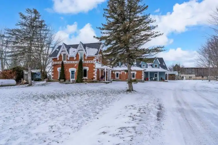 TIMBER-FRAME ESTATE ON 10 ACRES WITH INGROUND POOL, EXPANSIVE BARN, VERSATILE OUTBUILDINGS, & A 4,544 SQ FT HOME BUILT TO IMPRESS! Call it a farmhouse if you want, but this 10-acre estate works harder than most properties ever will, with outbuildings built to perform and a 4,544 sq ft home that redefines rural craftsmanship. Anchoring the property is a 4,500 sq ft barn with box stalls, paddocks, and tack space, a heated 62 x 38 ft saltbox-style workshop, an 18 x 28 ft drive shed, multiple accessory buildings, and a two-car garage, perfect for home-based businesses, contractors, or equestrian enthusiasts. The home stands among open fields and mature trees, showcasing steep gables, brick and board-and-batten siding, an updated steel roof, and an outdoor retreat with an inground saltwater 20 x 40 ft pool, a pool house with a shower and change room, and a timber-framed covered patio. The great room showcases true timber-frame craftsmanship, with soaring wood-plank ceilings, expansive arched windows, and a floor-to-ceiling stone fireplace crowned by a wood mantle and chandelier, and in-floor radiant heat throughout most of the home. Handcrafted wood cabinets, stone counters, open shelving, and a large island with an apron sink make the kitchen the perfect gathering place, while the breakfast nook invites casual mornings and the formal dining room provides an elegant setting with a fireplace and patio access. A main-floor office offers a dedicated workspace, while upstairs, a billiards room with vaulted ceilings and arched windows overlooks the great room and flows into a large family/games area. The primary suite enjoys its own private wing, accessed by a separate staircase, with a walk-in closet and ensuite featuring a jetted tub. Every part of this estate, from the surrounding acreage to the timber-frame home and equipped outbuildings, is ready to support a lifestyle of work, recreation, and country living at its finest.