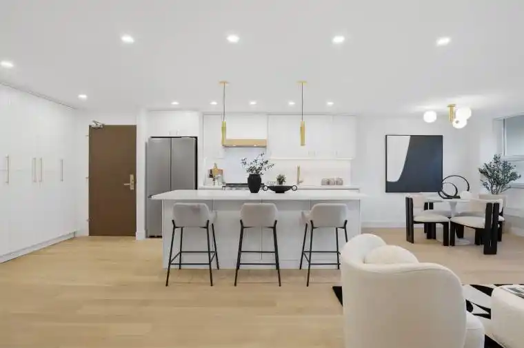Welcome Home to This Rarely Available, Fully Renovated 3-Bedroom Suite! Be the first to live in this completely renovated 3-bedroom residence, thoughtfully re-designed from top to bottom with exceptional attention to detail. This bright and spacious unit features an open-concept living and dining area with a walk-out to a large balcony offering peaceful northwest views overlooking lush, private treetops.High-end engineered hardwood flooring flows seamlessly throughout. The custom gourmet kitchen showcases quartz countertops and backsplash, premium stainless steel appliances, and a panel-ready dishwasher-ideal for both everyday living and entertaining.Each bedroom offers custom millwork and built-in storage. The generously sized primary bedroom includes a walk-in closet, while the luxurious bathrooms feature custom vanities and quartz countertops. Additional highlights include a beautifully designed in-suite laundry room with sink, a large custom entry closet, new doors and hardware throughout, and thoughtfully planned storage solutions.Includes parking and locker.The building’s common areas are being enhanced, with brand-new elevators and updated lobby furniture coming soon, adding even more value and comfort.A rare opportunity to be the first occupant of this stunning 3-bedroom home-truly a must-see and not to be missed.