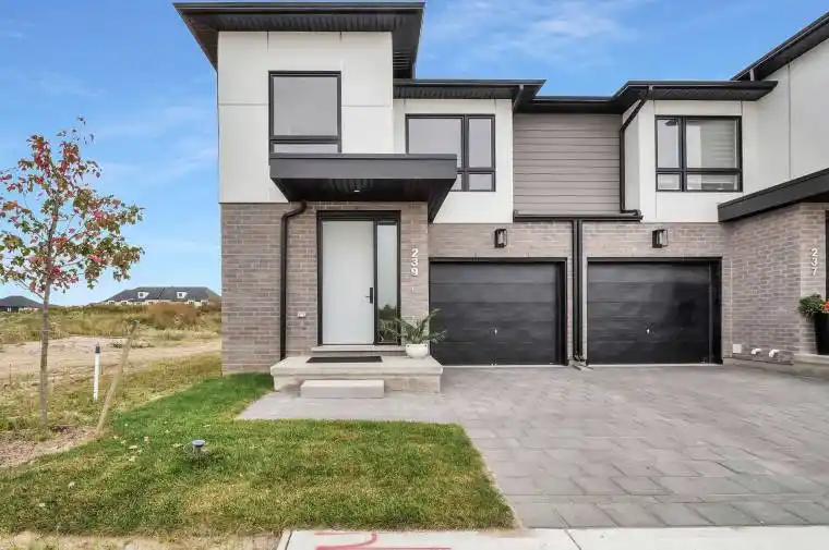 Located just minutes from London’s west end, the charming community of Kilworth offers a perfect blend of small-town atmosphere and everyday convenience. Set near the Thames River and surrounded by natural scenery, this area provides easy access to the city while enjoying a quieter setting. This modern townhome is part of the Aura development, known for its contemporary architecture and stylish design.This approximately 1,731 sq. ft. two-storey townhome features 3 bedrooms and a bright open-concept layout. Highlights include 9-foot ceilings, 8-foot interior doors, an oak staircase with steel spindles, wide-plank stone polymer composite flooring, pot lights, and modern fixtures throughout. The great room flows into a gourmet kitchen with quartz countertops, a large peninsula, modern cabinetry, and a stainless steel appliance package. The primary bedroom offers a spa-inspired ensuite with glass shower, double sinks, quartz counters, and a walk-in closet. Additional features include an unfinished basement, large windows, and a deck off the great room. Available February 15th