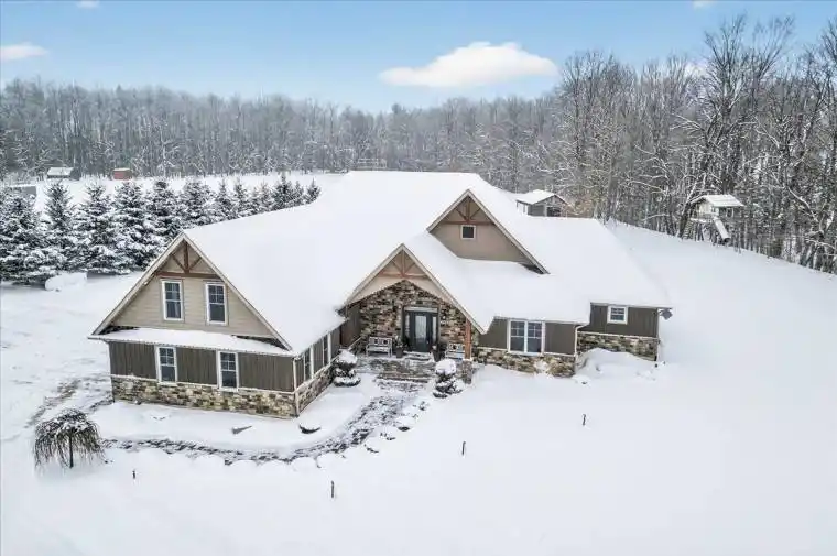 An Extraordinary Country Estate in New Lowell Set on a pristine 2-acre lot, this exceptional custom-built bungaloft offers 4,890 sq. ft. of refined living space. Designed to accommodate both everyday comfort & elevated entertaining, the home welcomes you with dramatic cathedral ceilings, reclaimed hardwood flooring & expansive floor-to-ceiling windows that fill the interior with natural light. A sophisticated double-sided fireplace creates a seamless connection between the main living areas & serves as a striking architectural centerpiece. The chef-inspired kitchen is as functional as it is beautiful, featuring a statement epoxy-finished island with seating, extensive cabinetry, & a thoughtfully designed walk-in pantry. The open-concept design ensures effortless flow into the dining living spaces, making it ideal for hosting and family gatherings alike.The primary retreat is a true sanctuary, offering a generous walk-in closet a spa-calibre six-piece ensuite complete with a freestanding soaker tub & a glass-enclosed walk-in shower with dual shower heads. The main level is further enhanced by three spacious additional bedrooms, a Jack-and-Jill bathroom, an extra full guest bath, & a well-appointed laundry & mudroom with direct access to the insulated, oversized double garage. Above, a versatile loft overlooks the main living space & offers endless potential as a media lounge, home office, or play area. The fully finished lower level expands the living space by more than 2,147sq. ft. & includes a walk-up to the garage. This level features a custom walk-in wine cellar, a dedicated fitness area with built-ins, a sleek three-piece bathroom, a large recreation room, & a flexible room currently used as an office, easily adaptable to a sixth bedroom. Outdoors, the property impresses with a paved driveway, ample parking, & a level, professionally maintained lawn supported by a 70-head in-ground sprinkler system-creating a serene backdrop for your Forever Home!