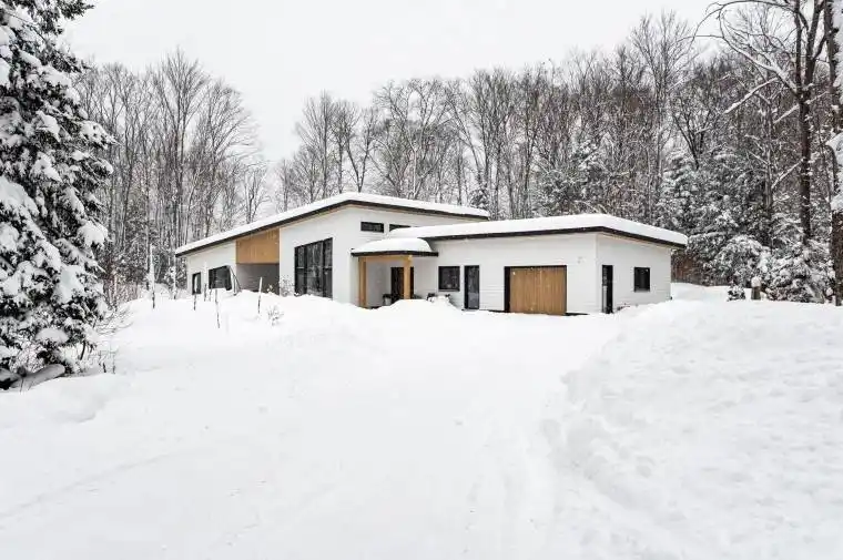 Curated by Thyme Design, renowned for creating healthy living spaces using sustainable practices that reflect Muskoka living & a refined northern aesthetic, this exceptional 3-bed, 2.5-bath bungalow embodies elevated modern luxury. Set on 2.6 acres with 260ft of frontage on a year-round municipally maintained road, the home sits toward the rear of the lot, approached by a meandering driveway offering great privacy. A spacious foyer with a striking wood fluted accent wall opens into the heart of the home, an expansive open-concept living, dining & kitchen area where wood-accented soaring ceilings & warm natural textures create a space both inviting & architecturally striking. The living room opens to a private patio, while the dining area features an elegant bar with dual beverage fridges. The chef’s kitchen impresses with a massive island, premium SS appliances & a walk-through butler’s pantry connecting to the mudroom, laundry & heated garage. The primary suite features 2 walk-in closets, a wall of west-facing windows & a spa-like 6-pc ensuite with double vanities, a soaker tub & a modern flush double shower. Two additional bedrooms share a stylish 5-pc guest bath. A versatile bonus room with an alcove entry provides extra family space, while a private office with exterior access & 2-pc powder room is ideal for working from home. Attention to detail continues with in-floor heating throughout the home & garage, a hidden 200 sq ft storage room above the kitchen with up to 8-ft ceilings, energy-efficient triple-pane wood aluminum-clad windows from Poland, added insulation, a solar-panel-ready roof, built-in speakers & an impressive suite of smart home features including a Sense Energy Monitoring System, Lutron Caseta switches, Ubiquiti networking, WiFi enabled garage door controller, WiFi controlled in-floor heating & a Dana smart lock. A masterful blend of design integrity, modern comfort & sustainable elegance, this home defines contemporary Muskoka living.