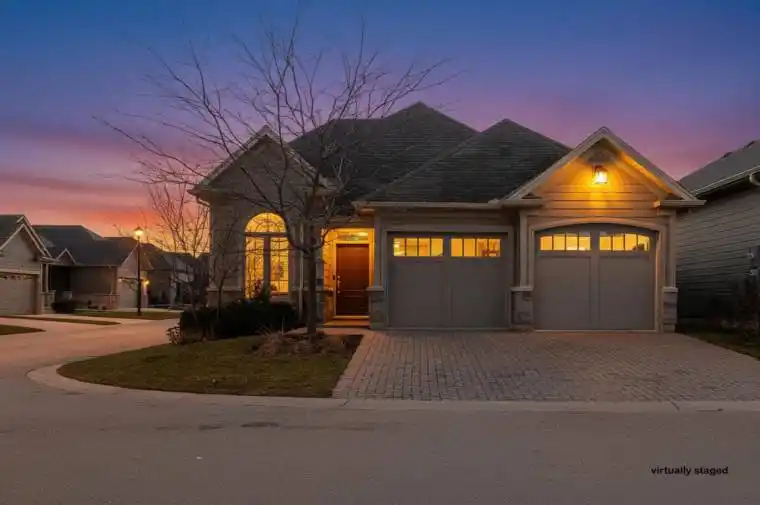Welcome to this well-designed one-floor condo offering comfort, accessibility, and low-maintenance living in a friendly community with an exclusive common space park area and full resident access to the Thames River. Located in beautiful Dorchester, Ontario, this home offers the charm of small-town living with quick access to local parks, trails, shops, and all the conveniences of nearby London. Inside, you’ll find 9 ft ceilings, crown moulding, transom windows, a covered front entry, and a bright kitchen with granite countertops, a front eating nook, built-in microwave, stainless steel fridge, gas stove, and dishwasher. The open family room includes a natural gas fireplace and walks out to a newly converted 3-season room overlooking the fenced backyard. The spacious primary bedroom offers a walk-in closet and private 4-piece ensuite with a soaker tub. Main-floor laundry with a sink, no stairs from the double garage into the home, and a chair lift to the basement adds excellent accessibility. The finished lower level includes a bedroom, 3-piece bath with shower, and a small office area, plus a large unfinished section for future development. Additional features include natural gas furnace, central air, water softener (owned). Condo fees of approximately $225-$230/month cover snow removal of roads, laneways, front sidewalks, and lawn cutting, making this the perfect low-maintenance lifestyle in a peaceful, well-kept Dorchester complex.