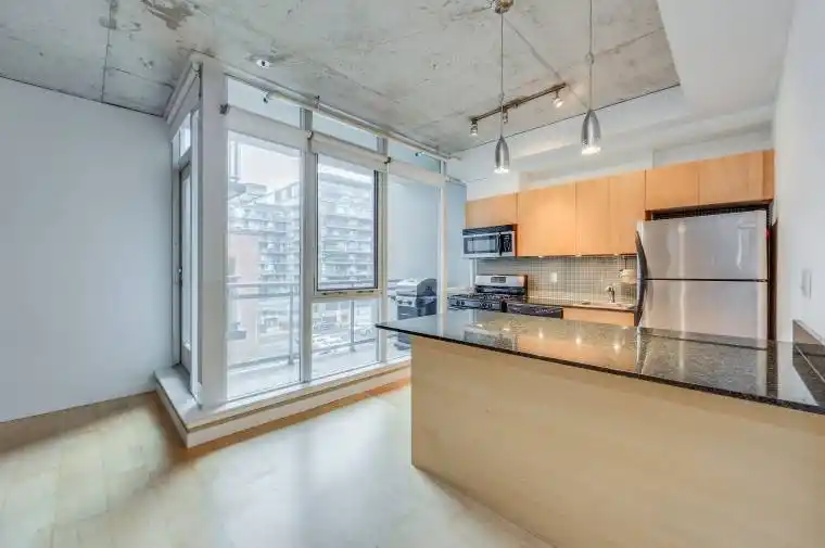 Tucked into the ever-popular Zed Lofts, this stylish one-bedroom residence offers true loft living in the heart of King West. The thoughtfully designed open layout is framed by soaring exposed concrete ceilings and dramatic floor-to-ceiling windows that flood the space with natural light. A modern kitchen anchors the home with stainless steel appliances, granite surfaces, a gas range, and a generous island perfect for cooking, dining, or entertaining. The bedroom features a rare walk-in closet, while a quiet northeast-facing balcony with a gas BBQ connection extends your living space outdoors. An ideal address for the urban professional who values design, convenience, and having the city’s best dining, shopping, and nightlife just steps away. Photos from previous listing.