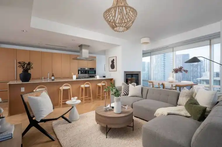 Experience elevated living in this beautifully appointed residence with sought-after NW exposure, offering abundant natural light and stunning sunset views. Freshly painted and professionally deep cleaned, this suite is truly move-in ready. Designed with refined taste, the home features elegant herringbone hardwood floors and a chef-inspired Boffi kitchen complete with an integrated Sub-Zero fridge, Miele built-in appliances, and a gas cooktop-perfect for both everyday living and entertaining. A sleek wine/beverage cooler adds an extra touch of sophistication. Unwind in luxurious Carrara marble-clad bathrooms and enjoy the convenience of custom walk-in closets in both bedrooms and hallway storage, along with a spacious walk-in closet in the primary suite. A dedicated laundry room provides added functionality and ease. Indulge in a hotel-inspired lifestyle with full-service amenities including a 24-hour concierge and doorman, spa access, and full access to the Miraj Hammam Spa (all on 5th floor). Wellness offerings include a 24-hour fitness center, yoga studio with scheduled classes, and a 20-metre indoor lap pool, hot tub, infrared sauna, and steam rooms. Enjoy in-building access to several high-end dining options, including The Lobby Lounge, Bosk Restaurant, and Mott32, along with hotel bar & lounge service and room service at your convenience.Complete with 1 parking space and 1 locker. Ace Carwash & detailing conveniently located in P1. A rare opportunity to own a sophisticated home that seamlessly blends luxury, comfort, and five-star living.