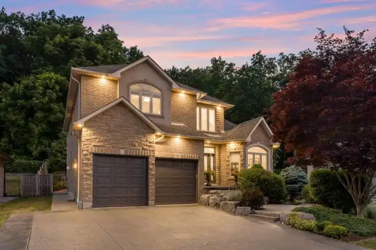 Escape the hectic pace of the modern world and step into your own private cottage retreat. Nestled gracefully beneath the Niagara Escarpment on a quiet crescent, this custom-built (2003) home sits on a premium pie-shaped lot backing onto lush, protected green space. This isn’t just a backyard; it’s a lifestyle. Imagine trading screen time for real-world adventures-watching your kids catch frogs by your private, multi-tiered waterfall or chase fireflies as the sun goes down. Spend your evenings soaking in the hot tub, letting the stresses of the day melt away to the tranquil sounds of trickling water and a gentle symphony of cicadas and grasshoppers. It is a true piece of calm in a busy world. Inside, that connection to nature continues. Oversized windows flood the meticulously maintained 4+1 bedroom home with natural light, complementing the soaring ceilings and elegant rounded corners. The freshly painted interior features a kitchen equipped with brand-new appliances (including a gas cooktop option) protected by a 4-year warranty, plus reverse osmosis water at every sink. When it’s time to unwind, the spacious primary suite serves as the ultimate sanctuary, featuring a two-sided gas fireplace shared with a luxurious, spa-like ensuite. Family living is made easy with walk-in closets in every single bedroom, central vac, and two fruit cellars. The fully finished basement offers fantastic in-law or income potential, boasting rare 9-foot ceilings, a separate entrance, and a roughed-in kitchen. Complete with an oversized exposed aggregate driveway parking six cars, this move-in-ready home perfectly balances the tranquility of nature with modern luxury.