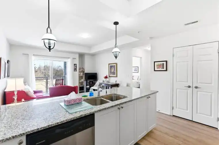 Welcome to your lakeside retreat at sought-after Harbourside Condos in Port Whitby – Durham’s best kept secret. This rarely offered, freshly painted 1 bedroom + Den suite offers a smart layout, thoughtful upgrades, and beautiful views that provide privacy and sunshine for your morning coffee on the covered balcony.The modern kitchen is designed for cooking and entertaining, featuring quartz counters, appliances, microwave above the stove. A breakfast bar overlooks the open-concept dining and spacious living area with walkout to the balcony, creating a seamless flow ideal for everyday living.The large primary bedroom features laminate flooring, a walk-in closet, and peaceful views. The versatile den is perfect as a home office, guest space, or exercise room. Extras include in-suite laundry, pantry, linen storage, owned underground parking, and a generous locker conveniently located behind the parking spot.Enjoy lakeside living with walking trails, fresh air, and the marina just steps from your door. Residents have access to a social pavilion with kitchen, lounge, and BBQ area – perfect for entertaining or meeting neighbours. Ample visitor parking and close proximity to amenities and the GO station make this an unbeatable location. Den Image has virtual staging.