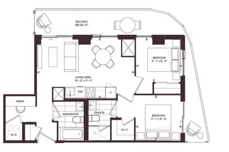 2B+Media in Canary House. This SE corner suite features a 188 sq. ft. wrap-around balcony with stunning city and lake views. Both bedrooms have windows, and the primary bedroom includes an ensuite and walk-in closet. The media space is perfect for a home office. Located steps from the YMCA and 18-acre Corktown Common Park, with vibrant street retail and dining on Front Street, including grocery stores, banks, cafes, and restaurants. Just a 15-minute streetcar ride to the Financial District and subway, plus a short walk to the Waterfront and Distillery District. Convenient access to DVP and Gardiner.