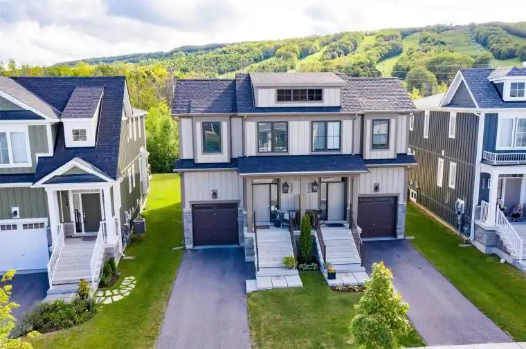FULLY FURNISHED, DECORATED AND COMPLETELY TURN-KEY WITH INCREDIBLE MOUNTAIN VIEWS OF BLUE MOUNTAIN’S SKI HILLS!! Premium Lot backing onto Georgian’s tree-lined trails. WALKING DISTANCE to the Blue Mountains Orchard Chairlift! Exclusive access to The Shed,” an exclusive recreation clubhouse with hot and cold pools, sauna, gym and party room. Sought after “MOWAT Model” featuring three spacious bedrooms, three and a half stylish bathrooms, all showcasing exceptional craftsmanship and thoughtful upgrades. Gas fireplaces are perfect for cozy nights in. BBQ hooked with gas line on deck is for you to enjoy. Upstairs you will love spa-like ensuite which features a soaker tub, glass shower, double sinks and custom blinds. Upstairs bedrooms have two queen sizes and a bunkbed. Over 2000 sqft of beautifully designed interior enhanced by Seller furniture and decor with many upgrades including coffered ceiling, fully finished basement with a 3 pc bathroom, 2 gas fireplaces, open staircase, wired for outdoor speakers & hot tub, 200 AMP electrical service, granite countertops, Samsung & Bosch stainless steel appliances including 5 burner gas stove, upgraded flooring. Walking distance to ski lifts, Village, golf course, fine dining restaurants, shopping, trails and much more!