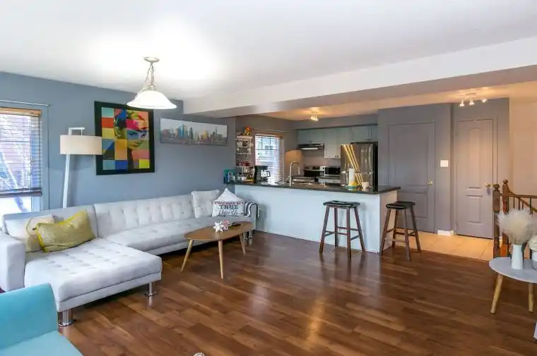 Stunning contemporary end-unit stacked townhouse offering just under 1,000 sq. ft. of stylish, functional living. The open-concept main level features a modern quartz kitchen and walk-out to a private balcony, perfect for relaxing or entertaining. The spacious primary bedroom includes a 4-pc ensuite and walk-in closet. Recent upgrades within the last five years include new flooring and fresh paint, complemented by colonial doors, track lighting, and horizontal wood blinds throughout. Ideally located near Credit Valley Hospital, transit, grocery stores, major highways, schools, shopping, and places of worship. Minutes to Meadowvale Town Centre and Erin Mills Town Centre, community centres, and hockey rinks.