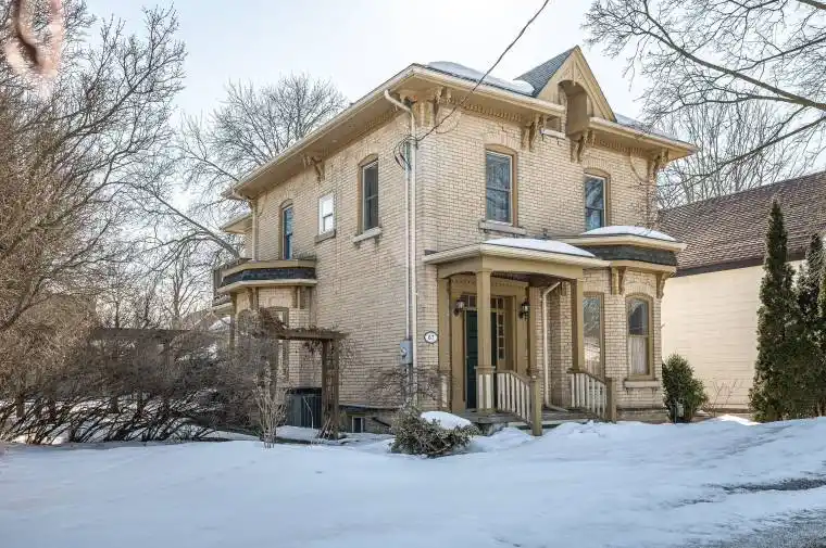 Six Seven Douro! Check it out, a gorgeous 2 storey yellow brick home located steps from downtown Stratford. Formerly operating as a B&B this home is flexible for its next use. B&B? Sure. Short Term Accommodation? Sure. Family home? Sure. There is room for the kids & bathrooms for all! Superb curb appeal on this 66′ frontage featuring a spacious side & rear yard w/ landscaping & raised gardens. The exterior is what everybody is looking for, yellow brick with period detailing and trimwork. A private drive leading to a detached garage. The interior has all the period charm you are looking for quartersawn oak hardwood flooring, original trims & millwork, heritage ceiling medallion & more. The spacious main level features a gracious formal living room & dining room, a 4th bedroom that could easily function as a home office or media room, a 3pc bath & a gorgeous updated granite eat-in kitchen w/ peninsula with loads of counter & cabinet space. To the rear of the kitchen is a flex space that could function as a family room or home office. The upper level holds 2 suites w/ private ensuite 3 pc washrooms, and a 3rd bedroom adjacent to the 4pc family bath. Nicely updated mechanicals. Come and experience the century home charm centrally located near the heart of Stratford. Call for more information or to schedule a private showing.