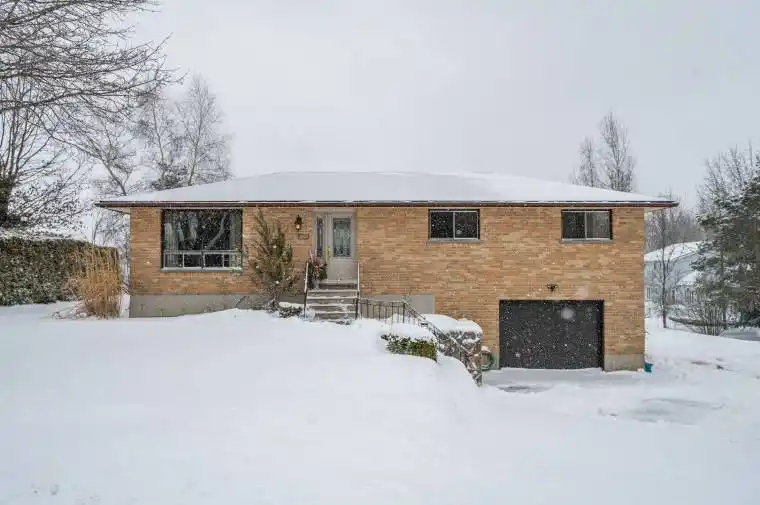 Custom built by Domm Construction in 1987 and proudly maintained by the original owners, this beautifully cared-for brick bungalow sits on a large lot on a quiet street in the welcoming community of Ayton. Set on a gentle hill, the home captures lovely countryside views while being within walking distance to local amenities.The bright main floor begins with a welcoming front entry and closet and leads into a stunning custom Hanover kitchen built in 2019. Designed with both style and function in mind, the kitchen features quartz countertops, a large island, convenient stackable laundry, and a full appliance package. The dining area offers sliding doors to the back deck-perfect for enjoying the peaceful surroundings-while the living room features a large picture window that fills the space with natural light.Three comfortable bedrooms with closets, a 4-piece bathroom with a granite counter on a newer vanity, and a hallway linen closet complete the main level.The finished lower level provides excellent additional living space with a large family room featuring a custom brick propane fireplace and bar area-ideal for entertaining or relaxing. This level also includes a 2-piece bathroom, utility room, and direct access to the attached garage with newer garage door. Outside, the spacious lot has mature trees and includes a double-wide driveway and attached garage. Enjoy the benefits of private well and septic with no municipal water or sewer fees. Bonus features: 200 amp service, air exchanger, water softener & hot water tank owned, flexible closing, family room furniture included. Wightman fibre at road, and cable TV available. Located within walking distance to the amenities of Ayton such as Trixies saloon, Ayton Ayto, Canada Post, Ayton Food Mart, Mum’s, Normanby Community School, and the scenic bridge overlooking the Ayton Mill Pond, this home offers the perfect blend of small-town living, space, and beautiful views.