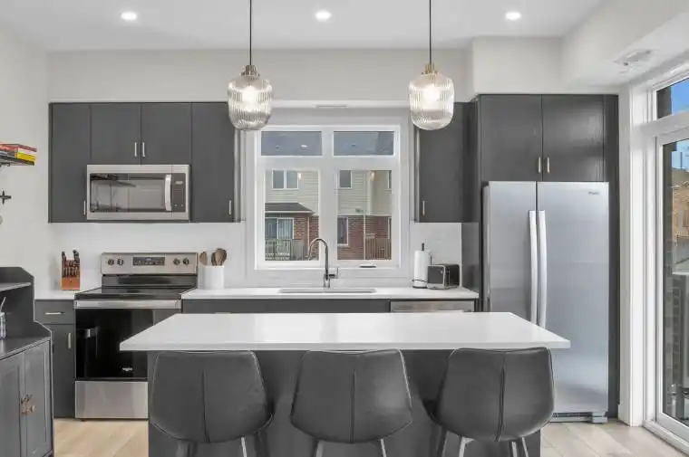 Welcome to 56-405 Myers Road in Cambridge! This bright and beautifully designed main floor end-unit stacked townhouse offers two bedrooms, two balconies, and a seamless blend of modern finishes and natural surroundings. As an end unit, the additional windows bring in an abundance of natural light, creating a warm and inviting atmosphere throughout. Backing onto peaceful trails and greenspace, this home offers a rare sense of privacy and a connection to nature, with both balconies facing the greenery. One balcony is conveniently located off the kitchen-perfect for morning coffee or evening unwinding-while the second is accessed from the bedroom, offering another quiet outdoor retreat. The open-concept layout is both functional and stylish, effortlessly connecting the living, dining, and kitchen areas. The kitchen is a standout feature, complete with stainless steel appliances, quartz countertops, ample cabinetry, and a large island with pendant lighting-ideal for gathering, cooking, or casual dining. Quartz surfaces continue into the bathrooms, adding a polished and cohesive feel throughout the home. Both bedrooms are well-sized and thoughtfully laid out, with the primary suite featuring its own ensuite with a glass shower. Ensuite laundry and a dedicated parking space add to the everyday convenience. Set in a well-connected neighborhood close to schools, parks, shopping, and recreational amenities, this home offers a comfortable and vibrant lifestyle with nature right at your doorstep.