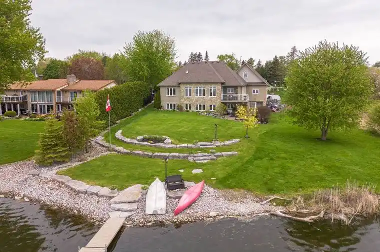 You CAN Have It All – Luxury Waterfront Living with Easy GTA Access! Opportunities like this on Lake Scugog are rare. This stunning custom-built waterfront home is ideally located just 15 minutes north of Port Perry & approx 50 minutes to the GTA, offering the perfect balance of luxury, privacy & convenience. From the moment you arrive, the impressive interlock driveway, wrought iron fencing, & armourstone landscaping create a striking first impression while drawing your eye to the spectacular panoramic lake views. Inside, sophisticated architectural details elevate the home, including coffered ceilings, hardwood floors, travertine stone fireplace & beautifully designed principal rooms that capture breathtaking water views. The chef-inspired kitchen is the heart of the home with custom wood cabinetry, granite countertops, stainless steel appliances & a breakfast bar ideal for everyday living & effortless entertaining. Bright open-concept living & dining areas are filled with natural light through expansive windows & enhanced by extensive pot lighting. Step through the garden doors to a lakeside deck-perfect for entertaining or enjoying peaceful mornings overlooking the water. This is the lifestyle buyers wait for. The primary suite offers a private retreat with his-and-her walk-in closets & a spa-inspired ensuite featuring a Jacuzzi tub & custom roll-in stone shower. The fully finished lower level adds exceptional versatility with a walkout to the lake, separate entrances, recreation room, second kitchen, two additional bedrooms & flexible space ideal for guests or multi-generational living. Car enthusiasts & hobbyists will appreciate the oversized upper & lower double garages with interior accesses & a large loft for additional storage. Rarely does a property offering this level of luxury, space & waterfront lifestyle become available so close to the GTA. Move quickly to secure your private lakefront retreat & be ready to enjoy the upcoming waterfront season!